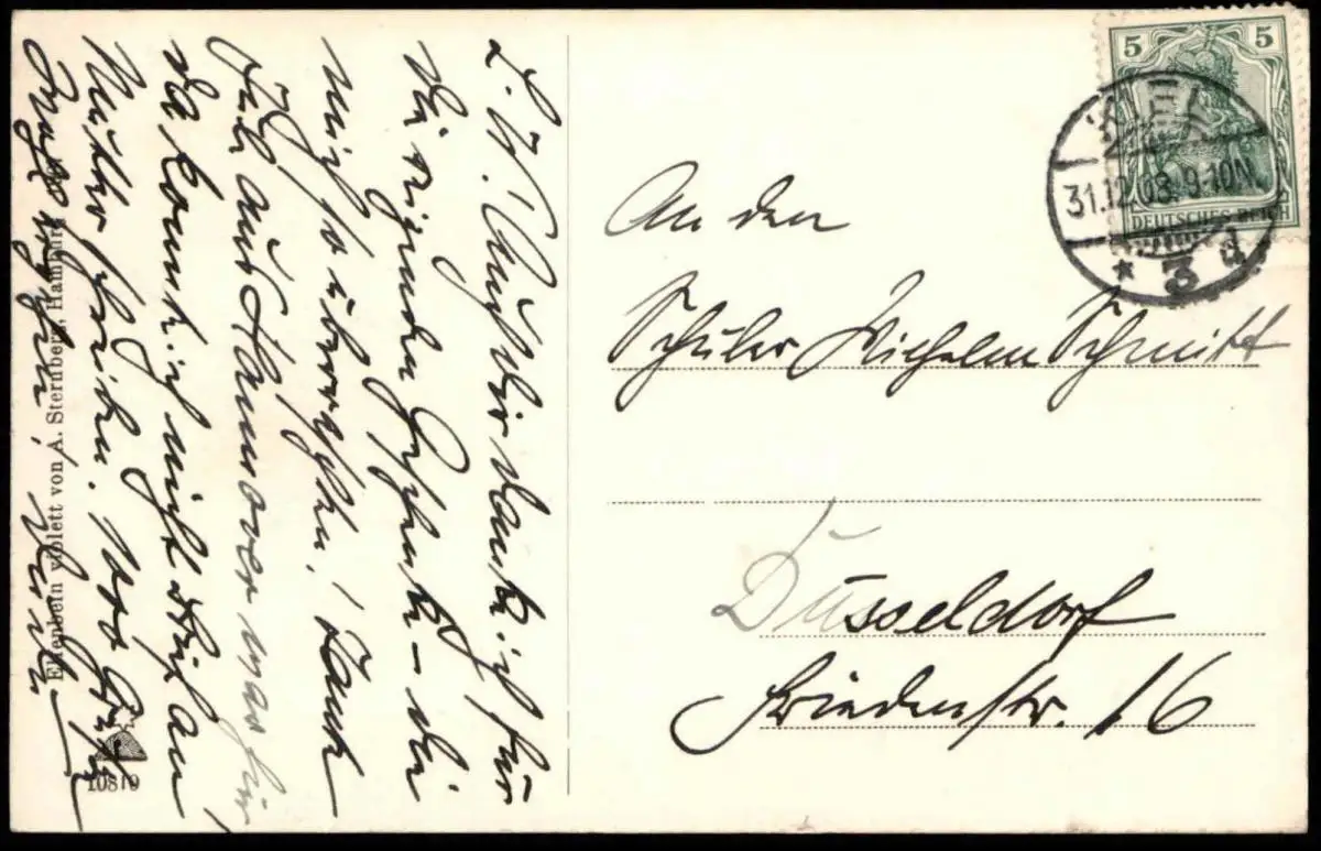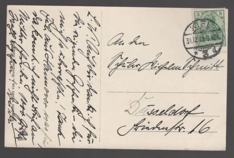 Gelaufen: 31.12.1908 mit Stempel Kiel nach Düsseldorf