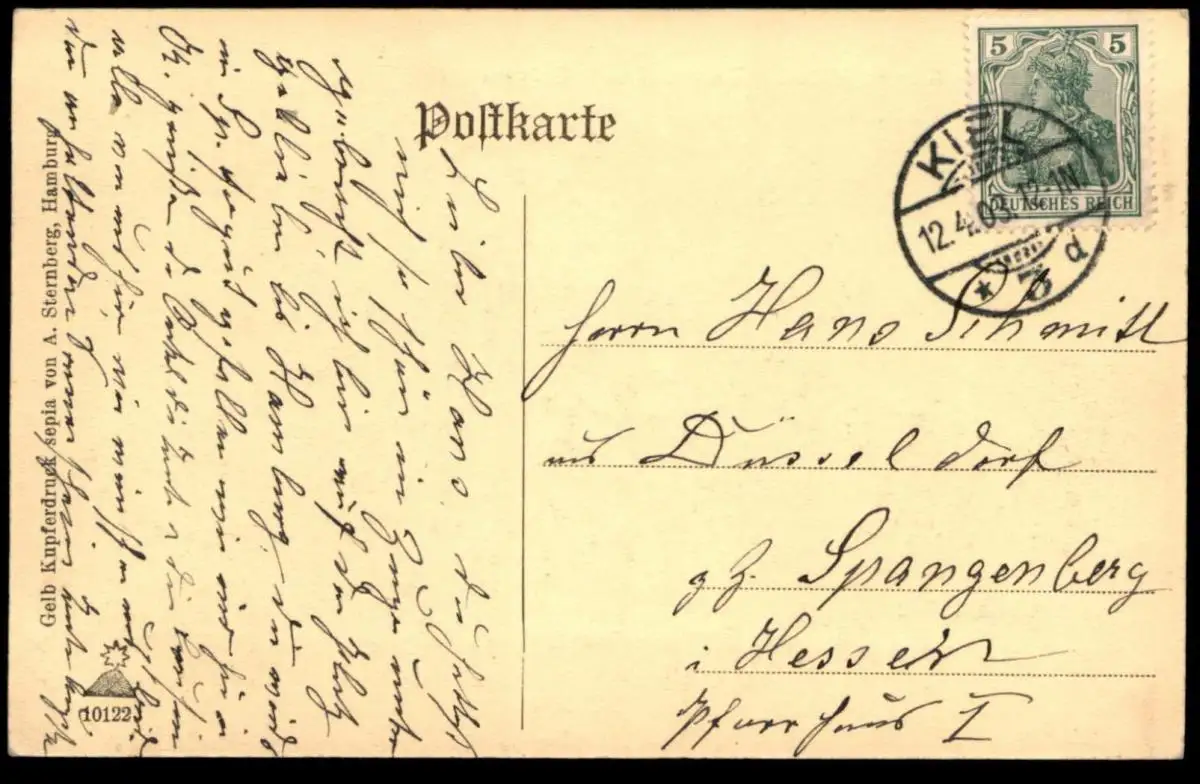 Gelaufen: 12.04.1903 mit Stempel Kiel nach Spangenburg