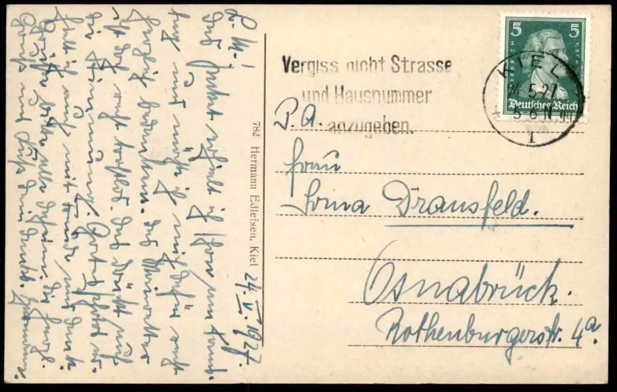 Gelaufen: 24.05.1927 mit Stempel Kiel nach Osnabrück