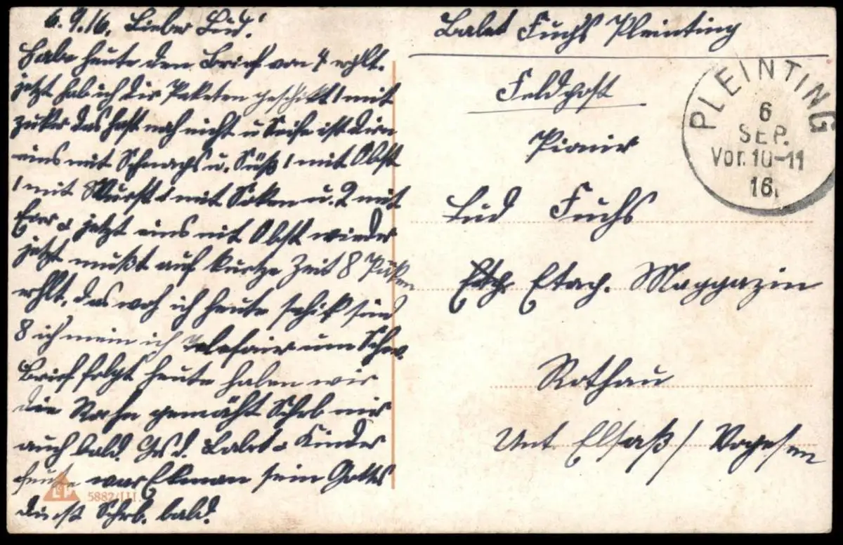 Gelaufen: 06.09.1916 als Feldpost mit Stempel Pleinting nach Rothau Unterelsass