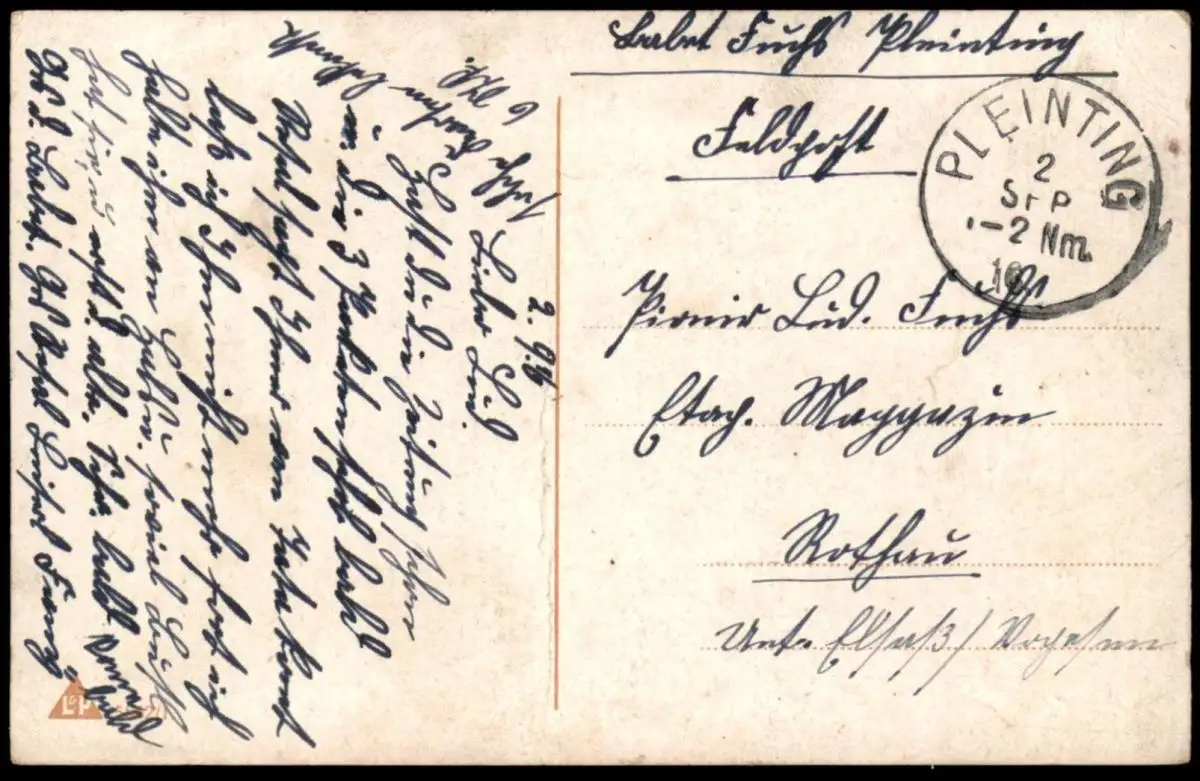 Gelaufen: 02.09.1916 als Feldpost mit Stempel Pleinting nach Rothau Unterelsass