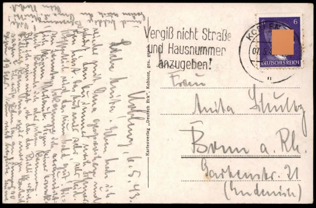 Gelaufen: 07.05.1943 mit Stempel Koblenz nach Bonn