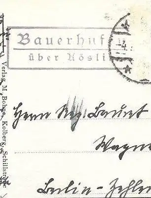 Gelaufen: 04.07.1936 nach Berlin Zehlendorf mit Rechteckstempel Bauerhufen (Choply) über Köslin (Koszalin), Briefmarke (sauber) entferntErhaltung (s. Scan): gut / 917145