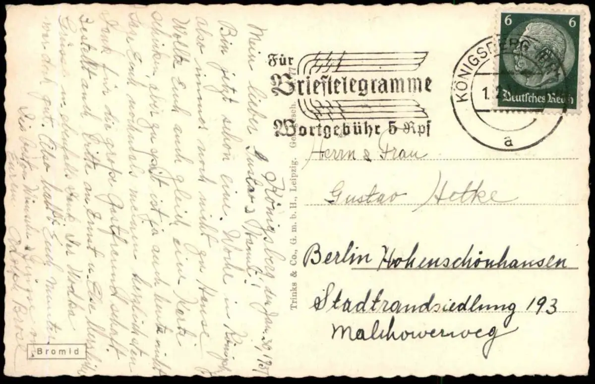 Gelaufen: 01.02.1930 mit Stempel Königsberg nach Berlin Hohenschönhausen Stadtrandsiedlung
