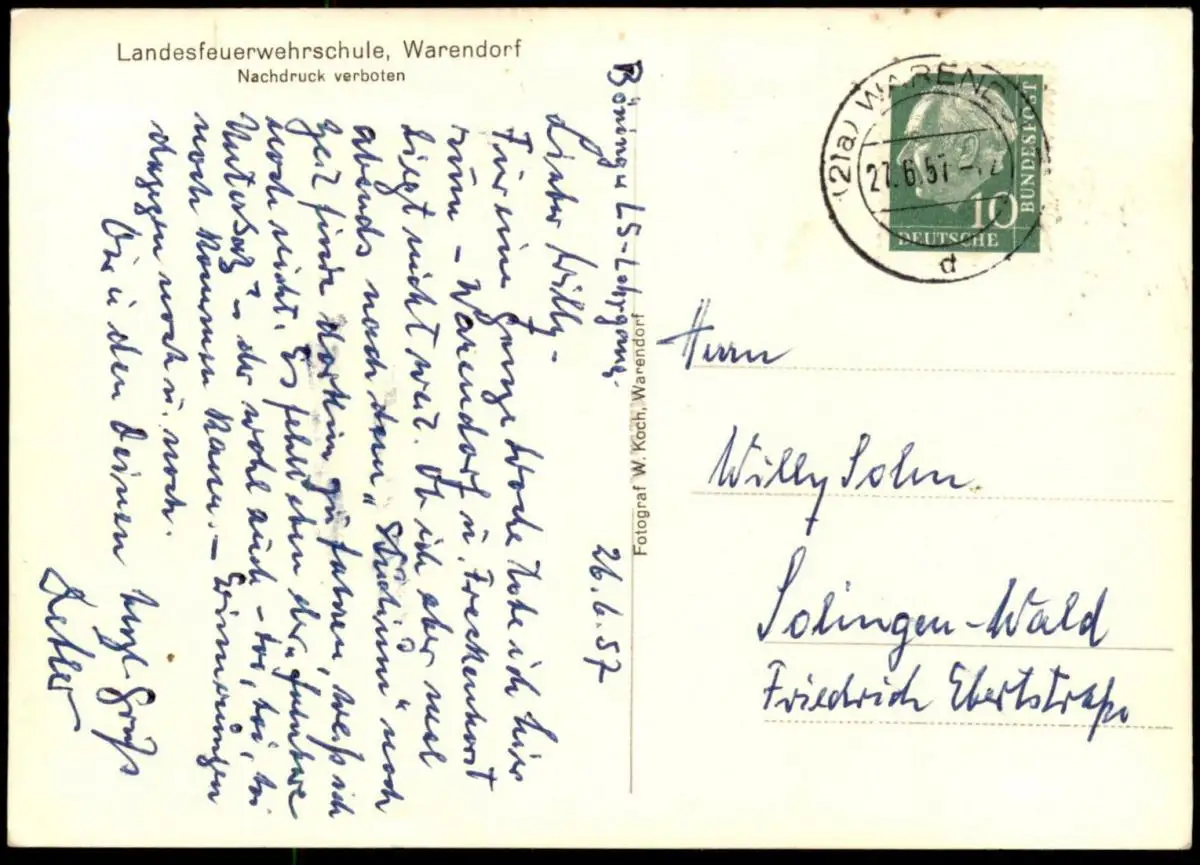 Gelaufen: 27.06.1957 mit Stempel Warendorf nach Solingen-Wald, Absender auf LS-Lehrgang