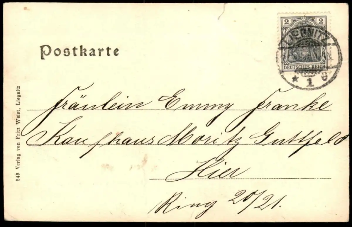 Gelaufen: 21.07.1903 mit Stempel Liegnitz nach “hier” Kaufhaus Moritz GuttfeldErhaltung (s. Scan): mittel - schlechter, oben mittig kleiner Einriss / 915719