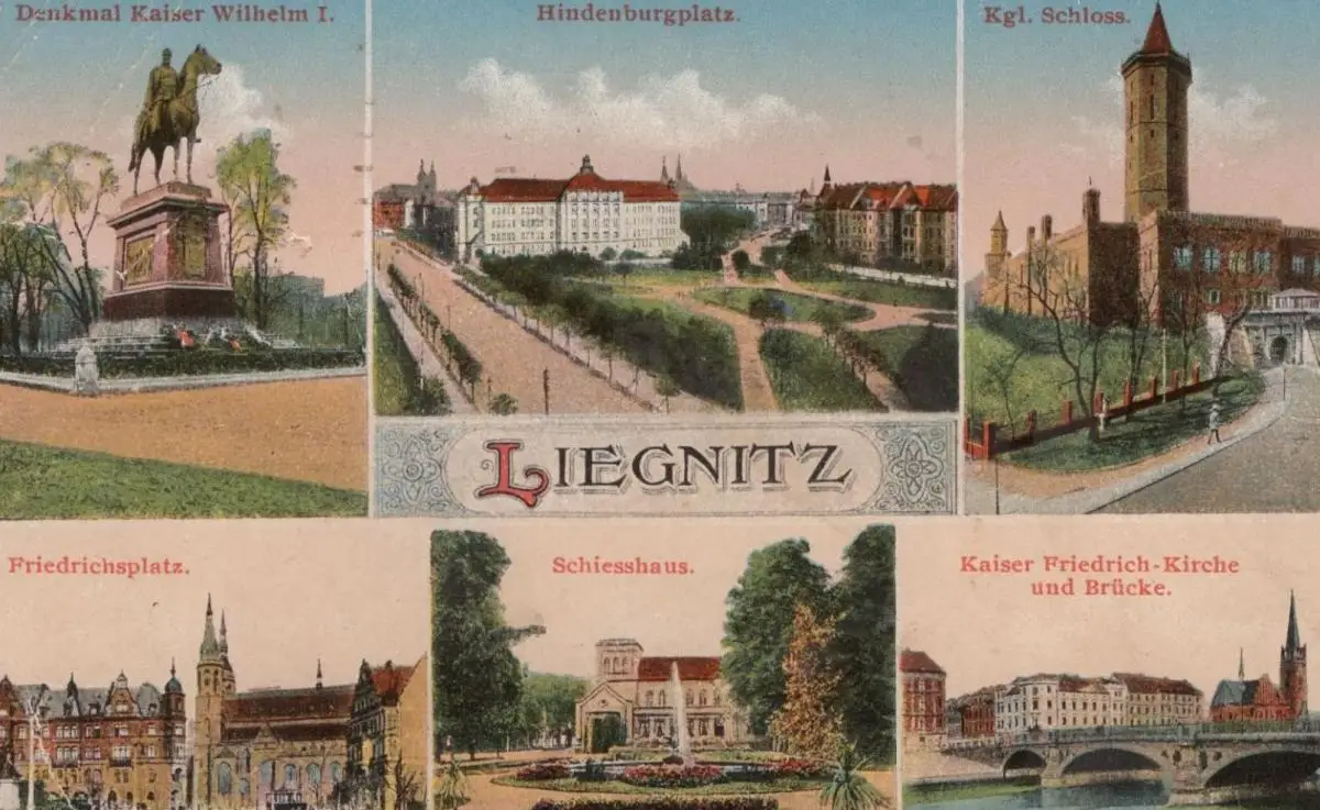 ALTE POSTKARTE LIEGNITZ SCHIESSHAUS HINDENBURGPLATZ FRIEDRICHSPLATZ DENKMAL KAISER WILHELM I. KÖNIGLICHES SCHLOSS KAISER FRIEDRICH KIRCHE UND BRÜCKEVerlag: M. U. L.