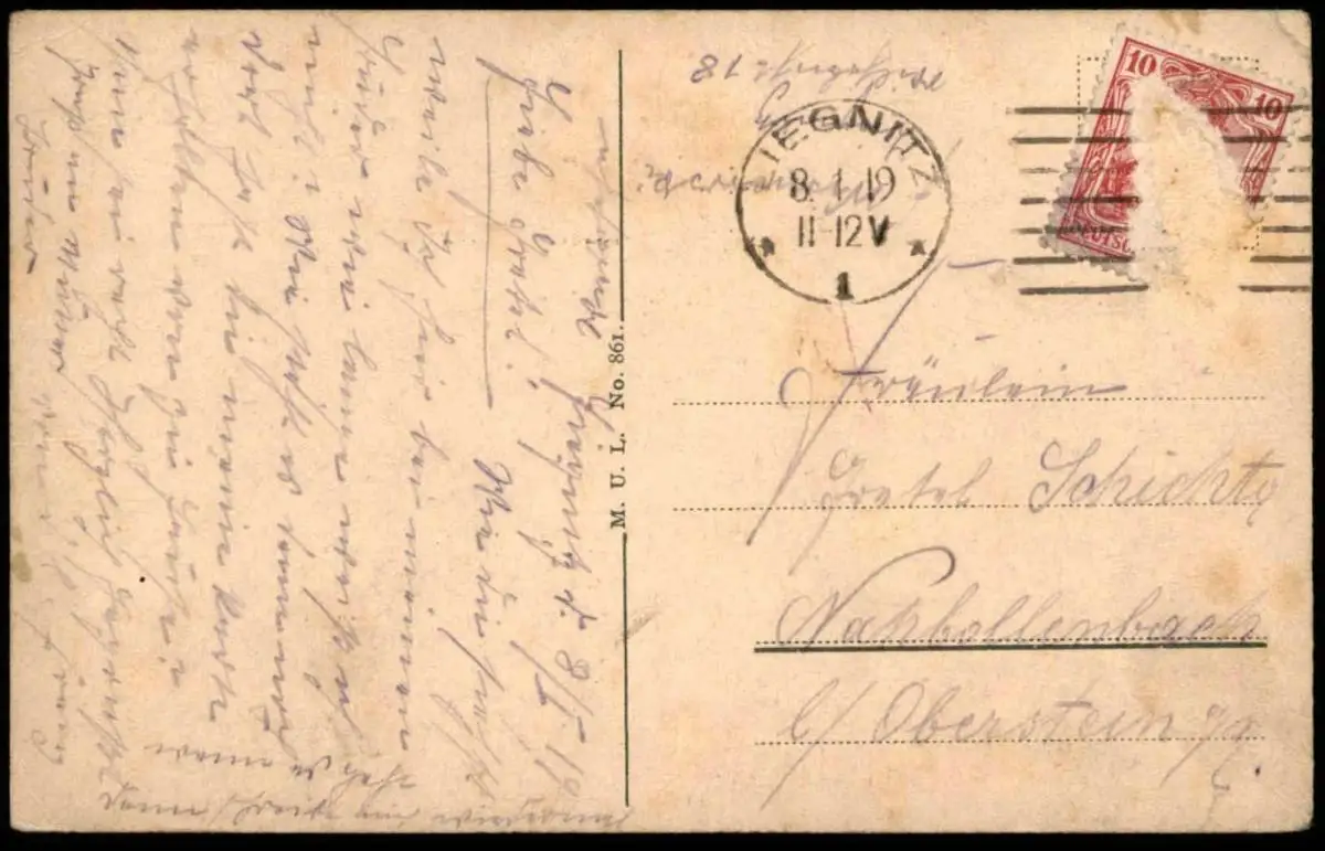 Gelaufen: 08.01.1919 mit Stempel Liegnitz nach Nahbollenbach bei Oberstein, Briefmarke teilweise entferntErhaltung (s. Scan): gut - mittel, Ecken etwas bestoßen / 917104