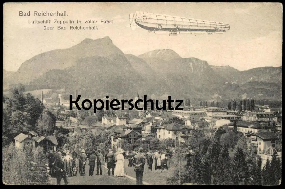 ALTE POSTKARTE LUFTSCHIFF GRAF ZEPPELIN IN VOLLER FAHRT ÜBER BAD REICHENHALL ZUSCHAUER VERM. PHOTO MONTAGEVerlag: B. Lehrburger, Nürnberg 1910