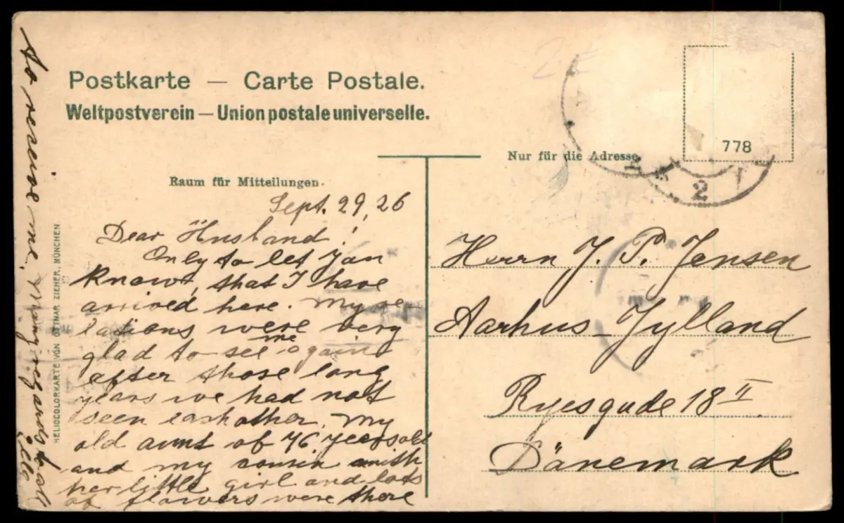 Gelaufen: 29.09.1926 nach Aarhus, Briefmarken (sauber) entfernt