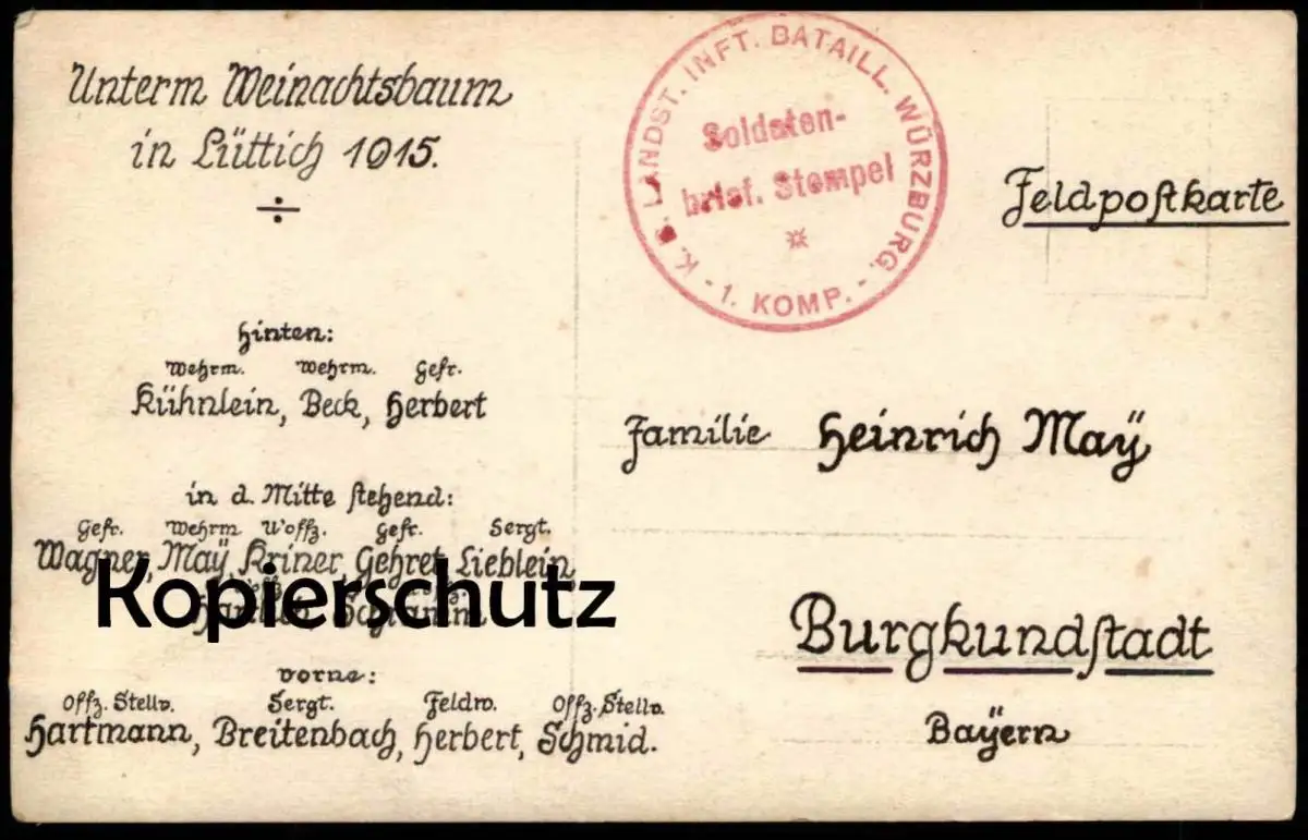 ALTE POSTKARTE LÜTTICH WEIHNACHTEN 1915 WEIHNACHTSBAUM SOLDATEN LANDSTURM INFANTERIE BATAILLON WÜRZBURG SOLDAT KÜHNLEIN BECK HERBERT WAGNER MAY KRINER GEHRET LIEBLEIN HARTLIEB SCHRAMM HARTMANN BREITENBACH SCHMIDVerlag: unbekannt
