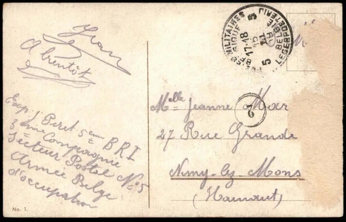 Gelaufen: 16.11.1919 mit Stempel Postes Militaires Belgique Belgie Legerposterij nach Nimy lez Mons