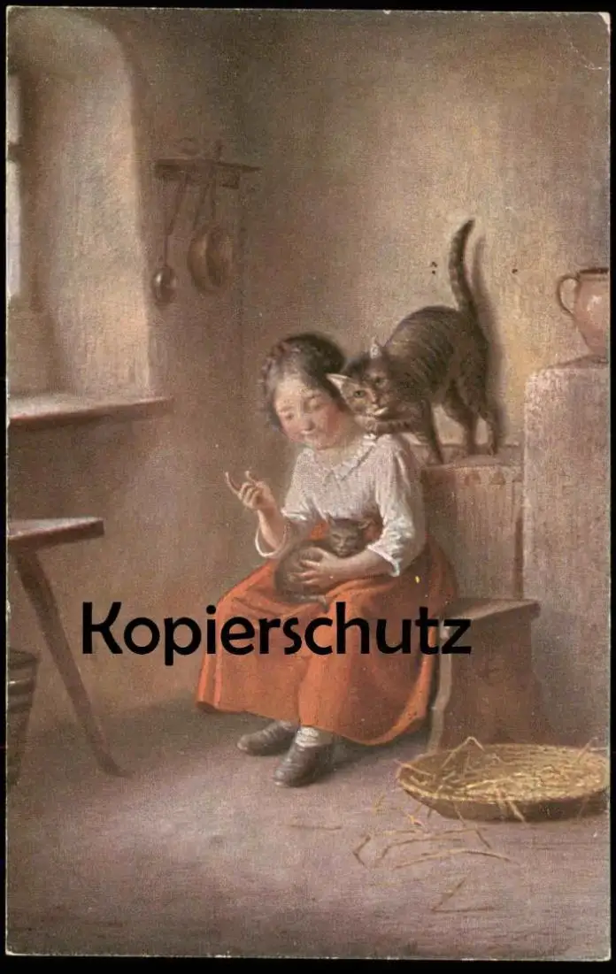 ALTE KÜNSTLER POSTKARTE MÄDCHEN FRAU MIT KATZE & KATZENKINDVerlag: unbekannt