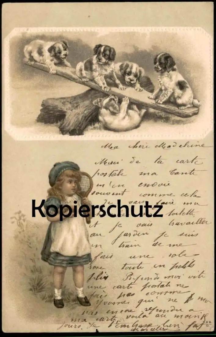 ALTE POSTKARTE MÄDCHEN MIT LAWN TENNIS SCHLÄGER HUNDE SPIELEN WELPEN AUF WIPPE BERNHARDINERVerlag: unbekannt