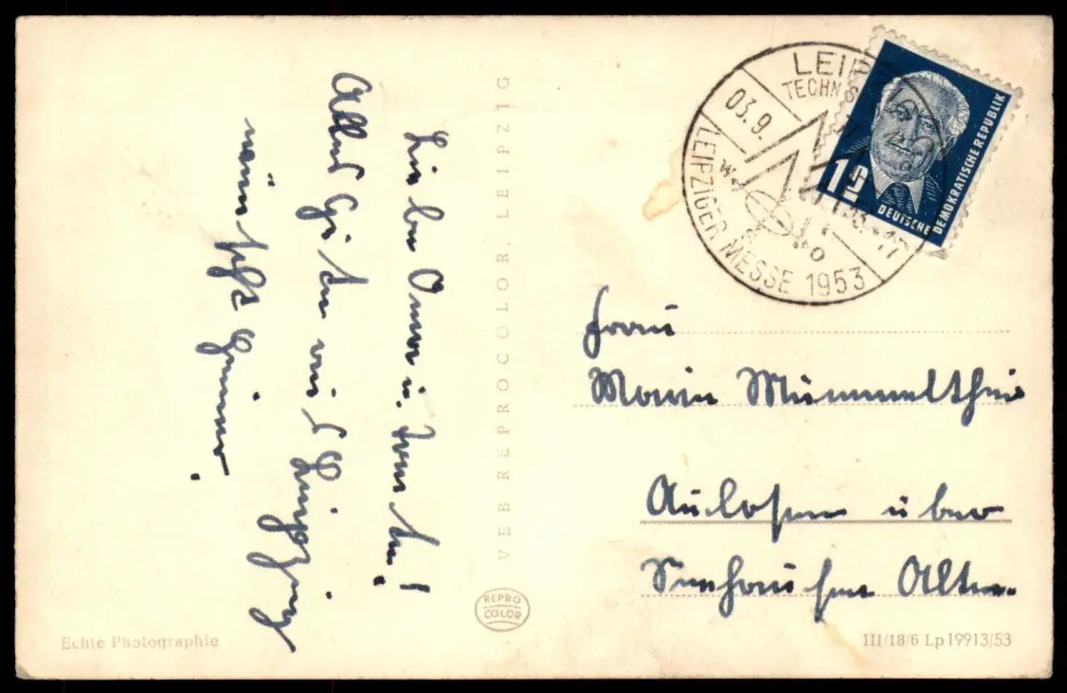 Gelaufen: 03.09.1953 mit Werbestempel „Leipziger Messe 1953“ nach Aulosen