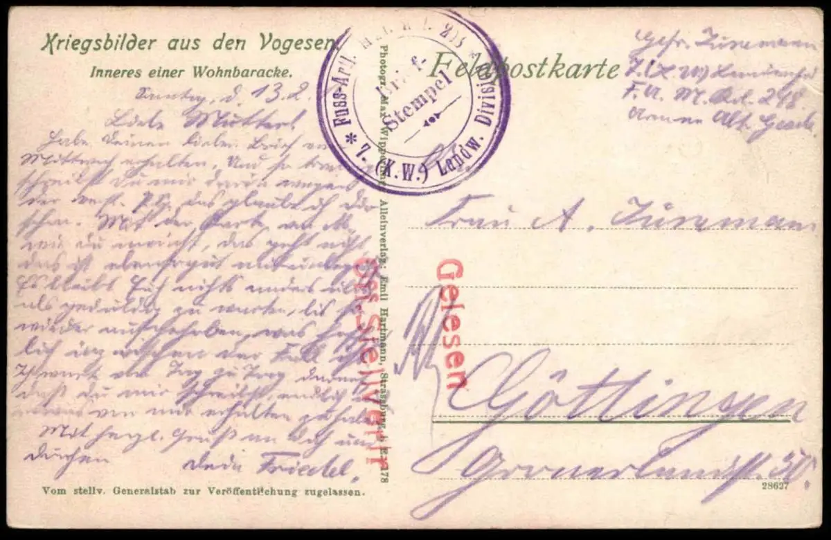 Gelaufen: 13.02.1916 als Feldpost mit Briefstempel Landwehr Division Fuss-Artillerie nach Göttingen, zusätzlich Stempel Gelesen Gef. Stellvertreter