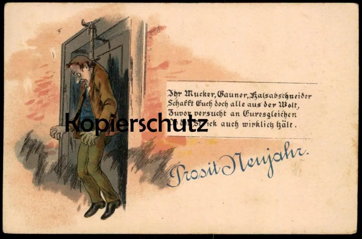 ALTE POSTKARTE PROSIT NEUJAHR IHR MUCKER GAUNER HALSABSCHNEIDER SCHAFFT EUCH DOCH ALLE AUS DER WELT, ZUVOR VERSUCHT ES AN EURESGLEICHEN OB DER STRICK AUCH WIRKLICH HÄLT SELBSTMORD ERHÄNGENVerlag: unbekannt