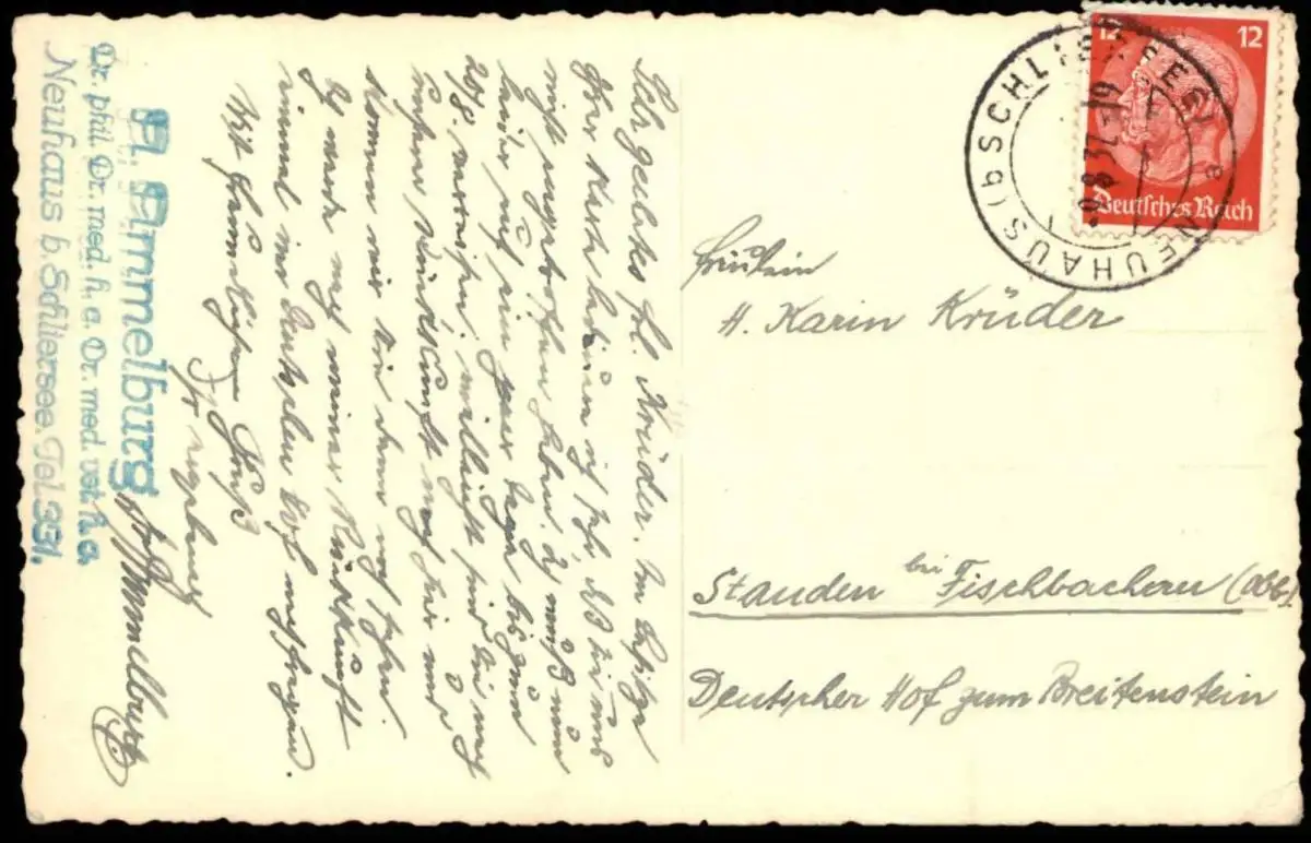 ALTE POSTKARTE NEUHAUS SCHLIERSEE WOHNHAUS VERFASSER DR. PHIL. DR. MED. H. C. DR. VET. H. C. ADOLF HEINRICH AMMELBURGVerlag: unbekanntGelaufen: 09.08.1937 mit Stempel Neuhaus Schliersee nach Stauden bei Fischbachau Deutscher Hof zum BreitensteinErhaltung (s. Scan): sehr gut / 916941