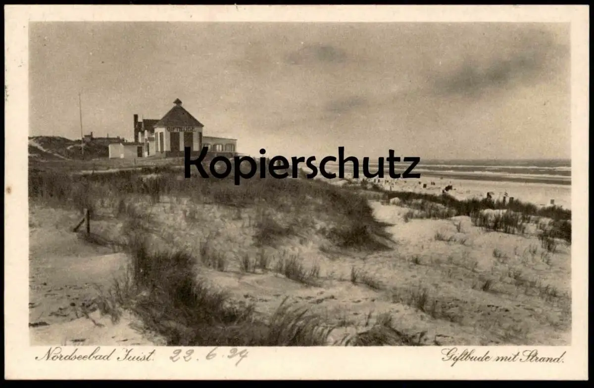 ALTE POSTKARTE NORDSEEBAD JUIST GIFTBUDE AM STRAND