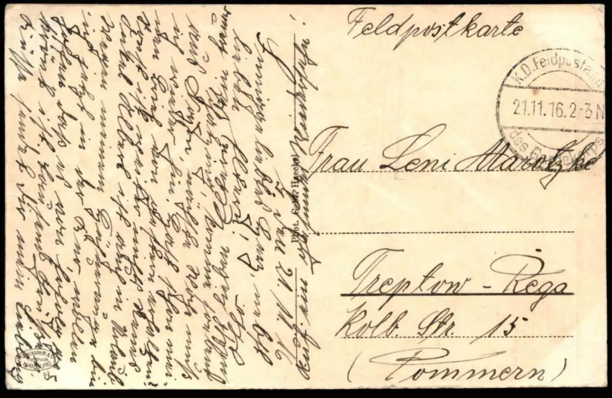 Gelaufen: 21.11.1916 als Feldpost nach Treptow Rega Pommern