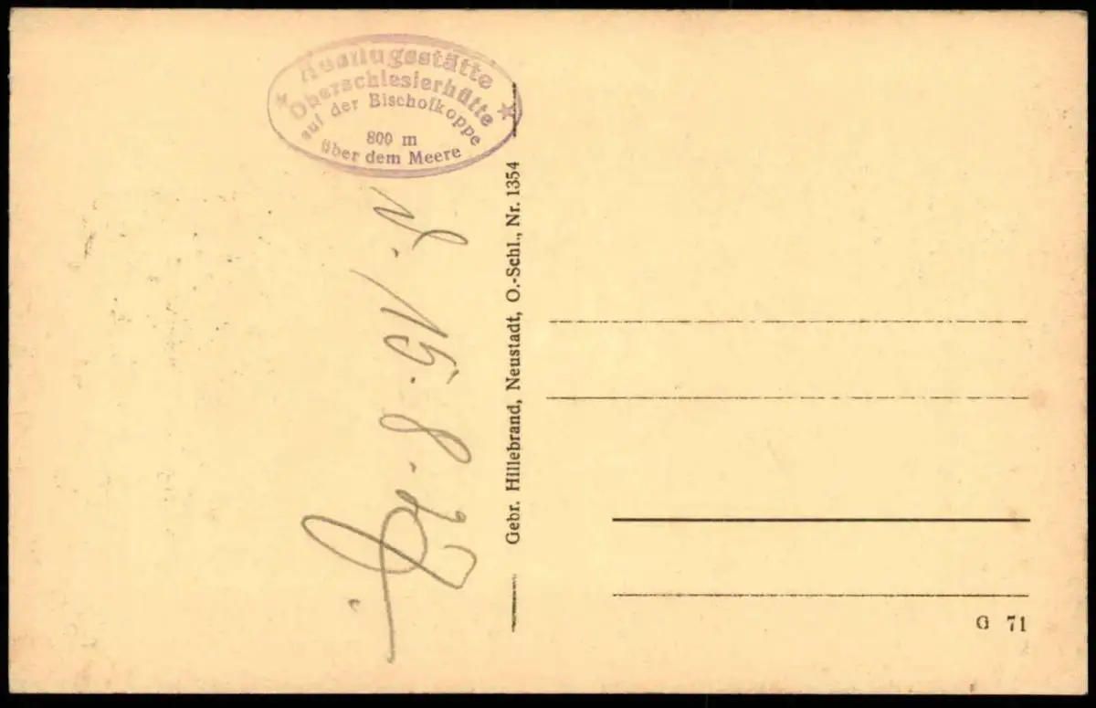 ALTE POSTKARTE OBERSCHLESIERHÜTTE AUF DER BISCHOFKOPPE SCHLESIEN STEMPEL AUSFLUGSSTÄTTE OBERSCHLESIERHAUS AUF DER BISCHOFKOPPE 800 METER ÜBER DEM MEERE