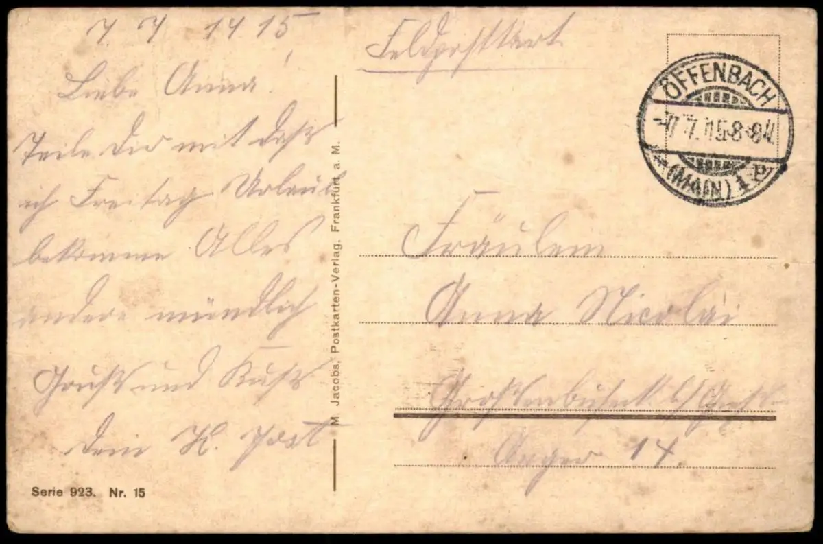 Gelaufen: 07.07.1915 als Feldpost mit Stempel Offenbach
