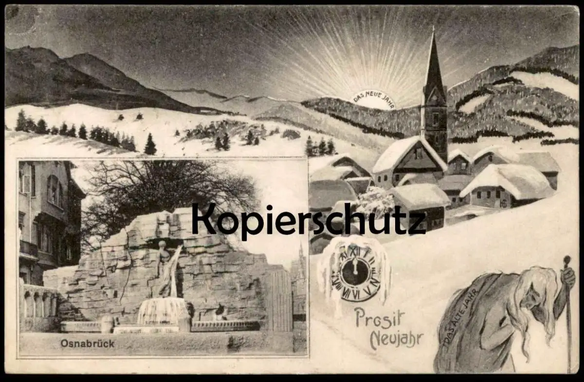 ALTE POSTKARTE OSNABRÜCK PROSIT NEUJAHR HAARMANNSBRUNNEN DAS NEUE JAHR SONNE DAS ALTE JAHR GREIS Ansichtskarte AK cpa