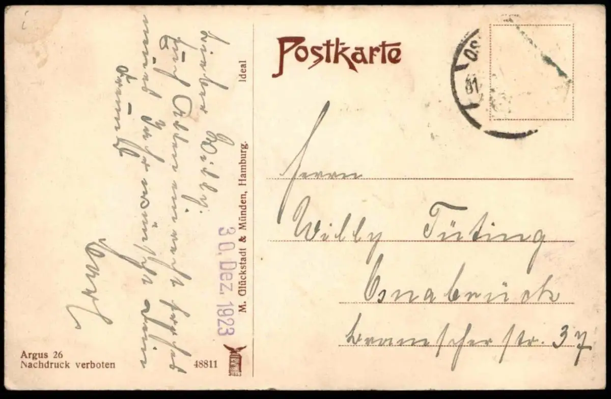 Gelaufen: 30.12.1923 mit Stempel Osnabrück nach Osnabrück, Briefmarke (sauber) entfernt