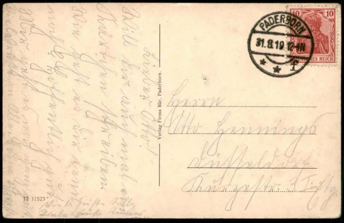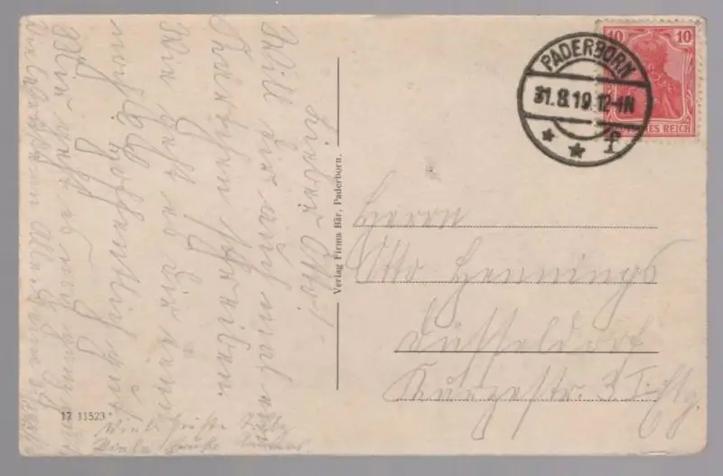 Gelaufen: 31.08.1919 mit Stempel Paderborn nach DüsseldorfErhaltung (s. Scan): mittel, mittiger Stecknadelstich / 915790