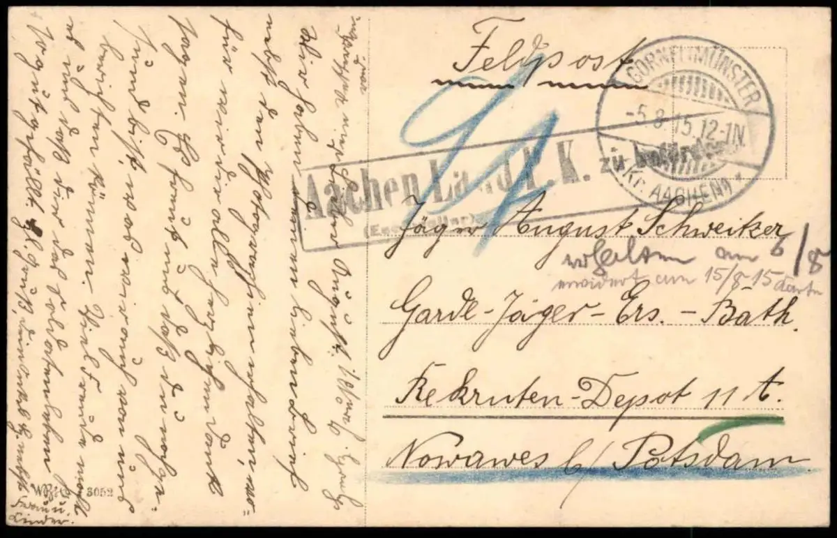 Gelaufen: 05.08.1915 als Feldpost mit Stempel Cornelimünster sowie Aachen Land nach Nowawes bei Potsdam