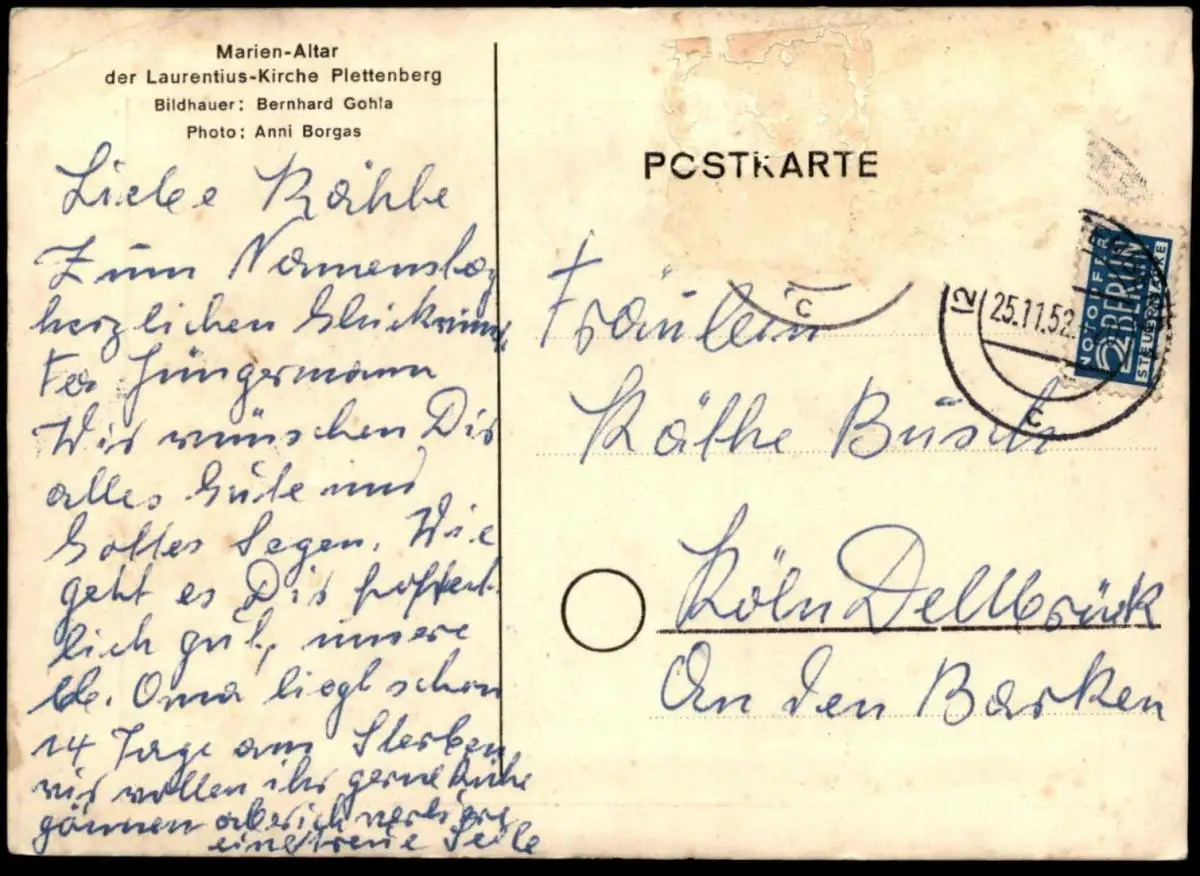 ALTE POSTKARTE PLETTENBERG MARIEN-ALTAR LAURENTIUS KIRCHE BILDHAUER BERNHARD GOHLA FOTO ANNI BORGAS SAUERLAND