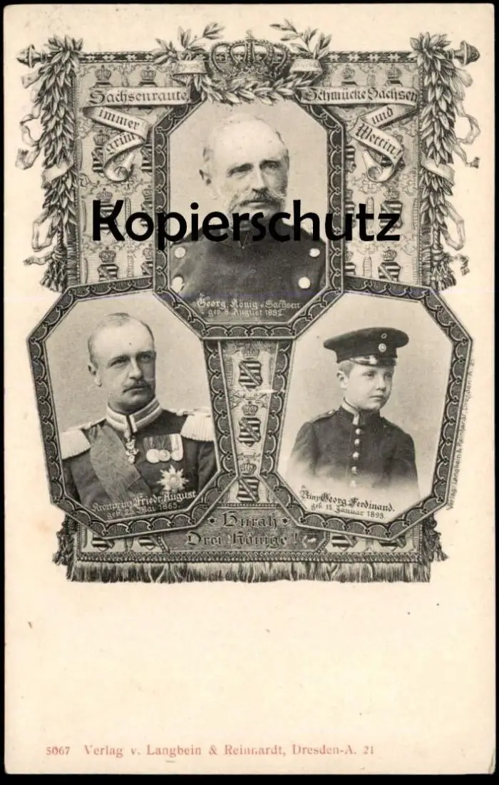 ALTE POSTKARTE PORTRÄT KÖNIG GEORG VON SACHSEN GEBOREN 08.08.1832 PRINZ GEORG FERDINAND GEBOREN 15.01.1893 KRONPRINZ FRIEDRICH AUGUST GEBOREN 25.05.1865 SACHSENRAUTE IMMER GRÜN