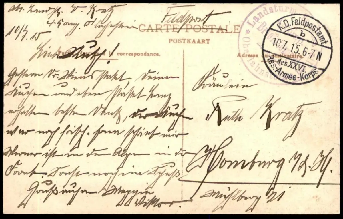 Gelaufen: 10.07.1915 als Feldpost Landsturm Oberlahnstein K. D. Feldpostamt des XXVI. Res.-Aramee-Korps nach Homburg vor der Höhe