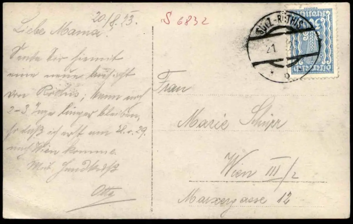 Gelaufen: 20.08.1923 mit Stempel Sulz-Röthis nach Wien