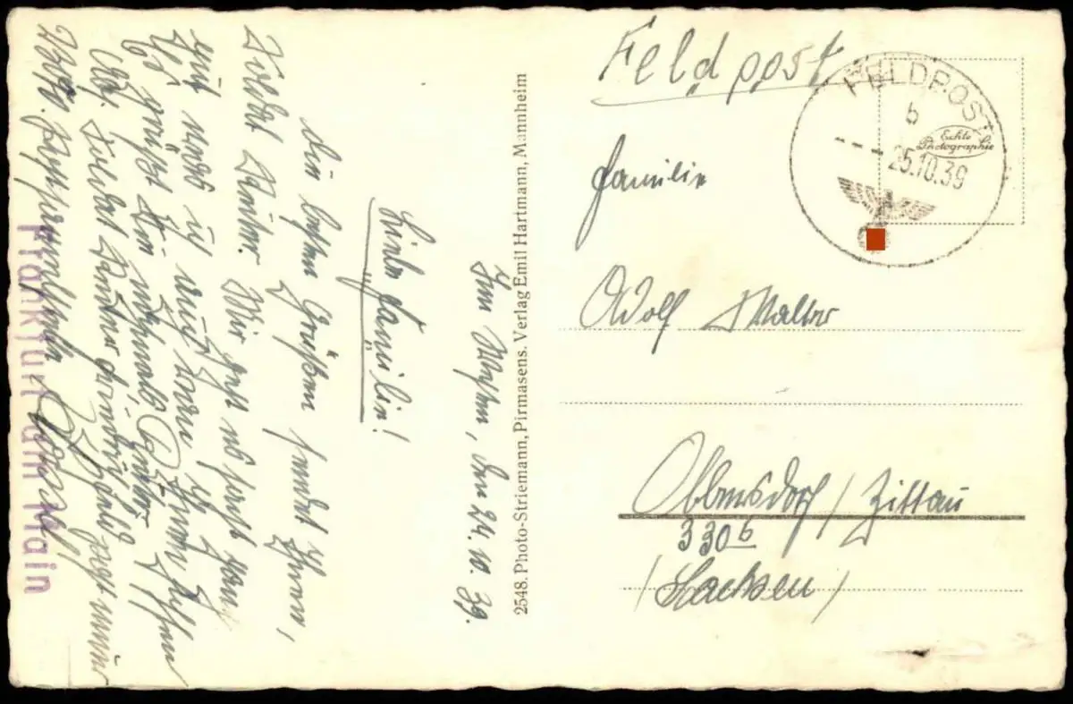 Gelaufen: 25.10.1939 mit Stempel Feldpost nach Olbersdorf Zittau