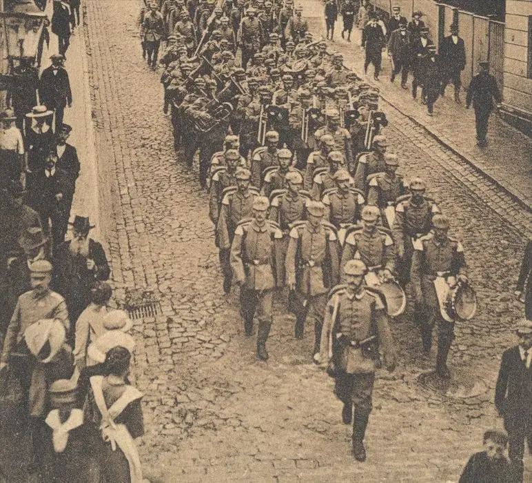 ALTE POSTKARTE SCHLESWIG AUSMARSCH UNSERER 84er AM 08. August 1914