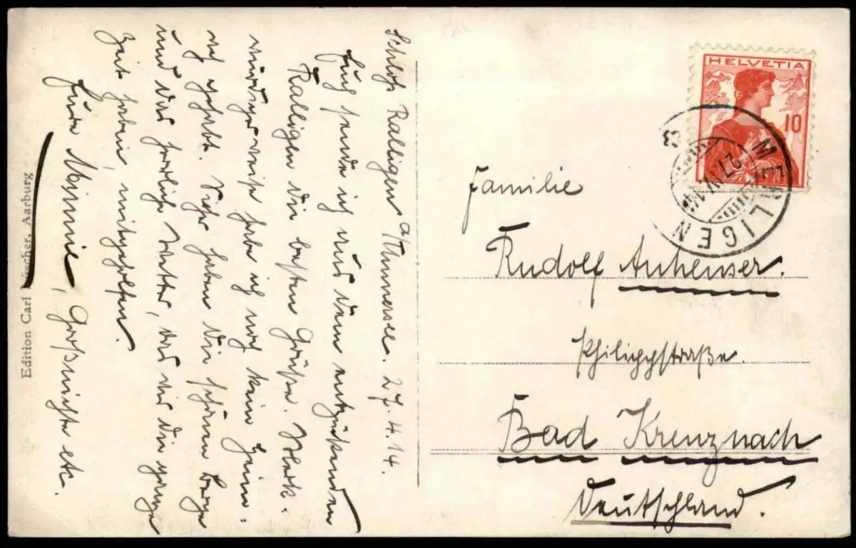 Gelaufen: 27.04.1914 mit Stempel Merligen nach Bad Kreuznach