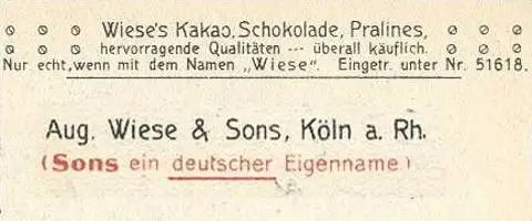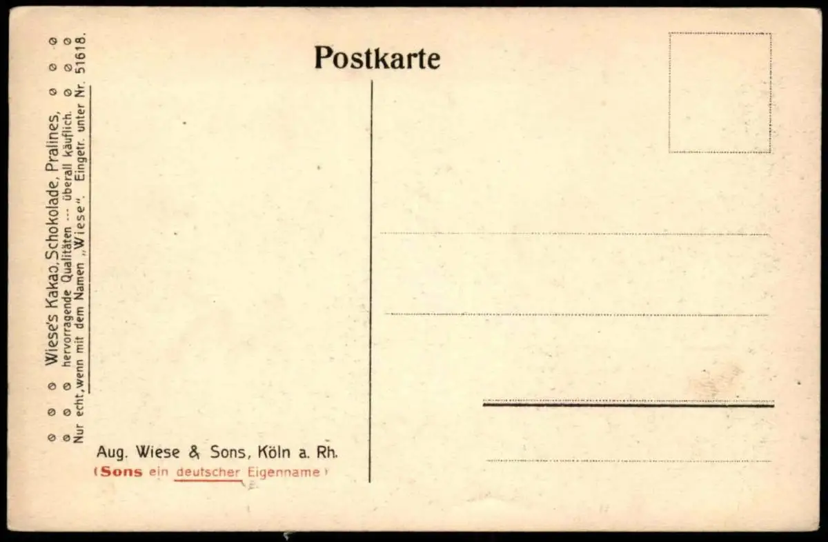 WIESE´S KAKAO SCHOKOLADE PRALINES KÖLNVerlag: Aug. Wiese & Sons, Köln