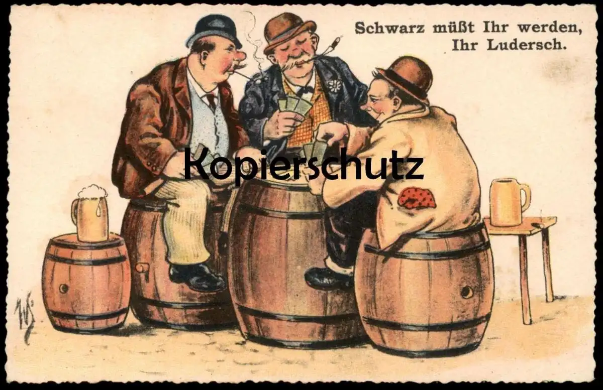 ALTE POSTKARTE SKAT SCHWARZ MÜSST IHR WERDEN IHR LUDERSCH WILLI SCHEUERMANN SKATSPIEL Karten Bier AK cpa postcard