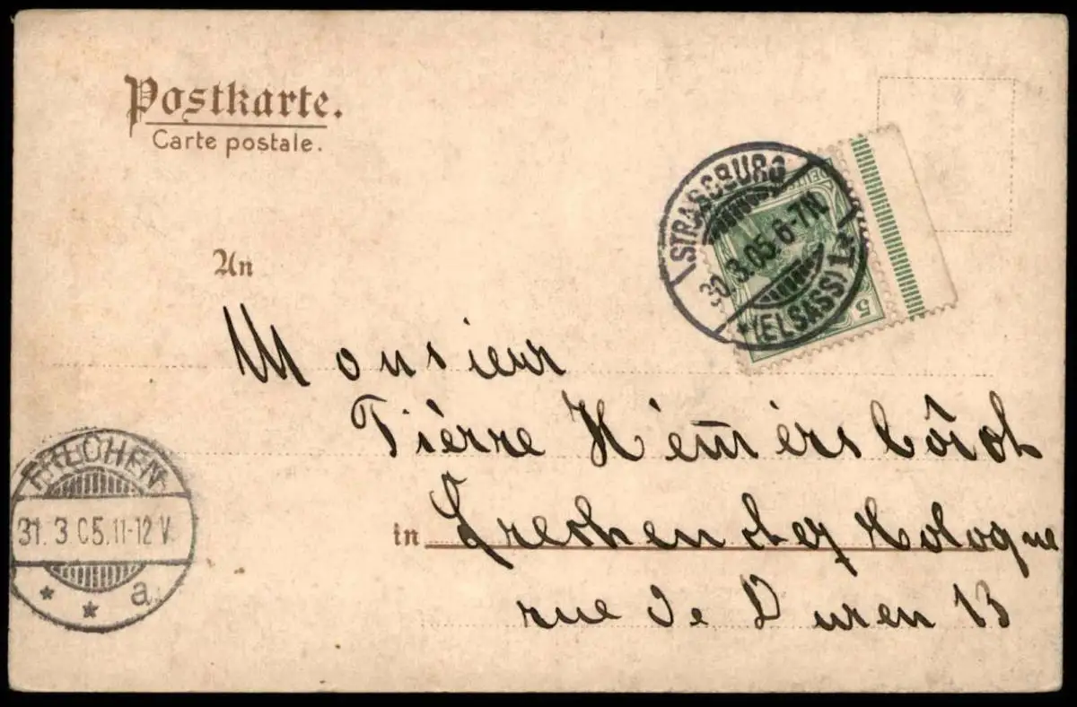 Gelaufen: 30.03.1905 mit Stempel Strassburg nach Frechen