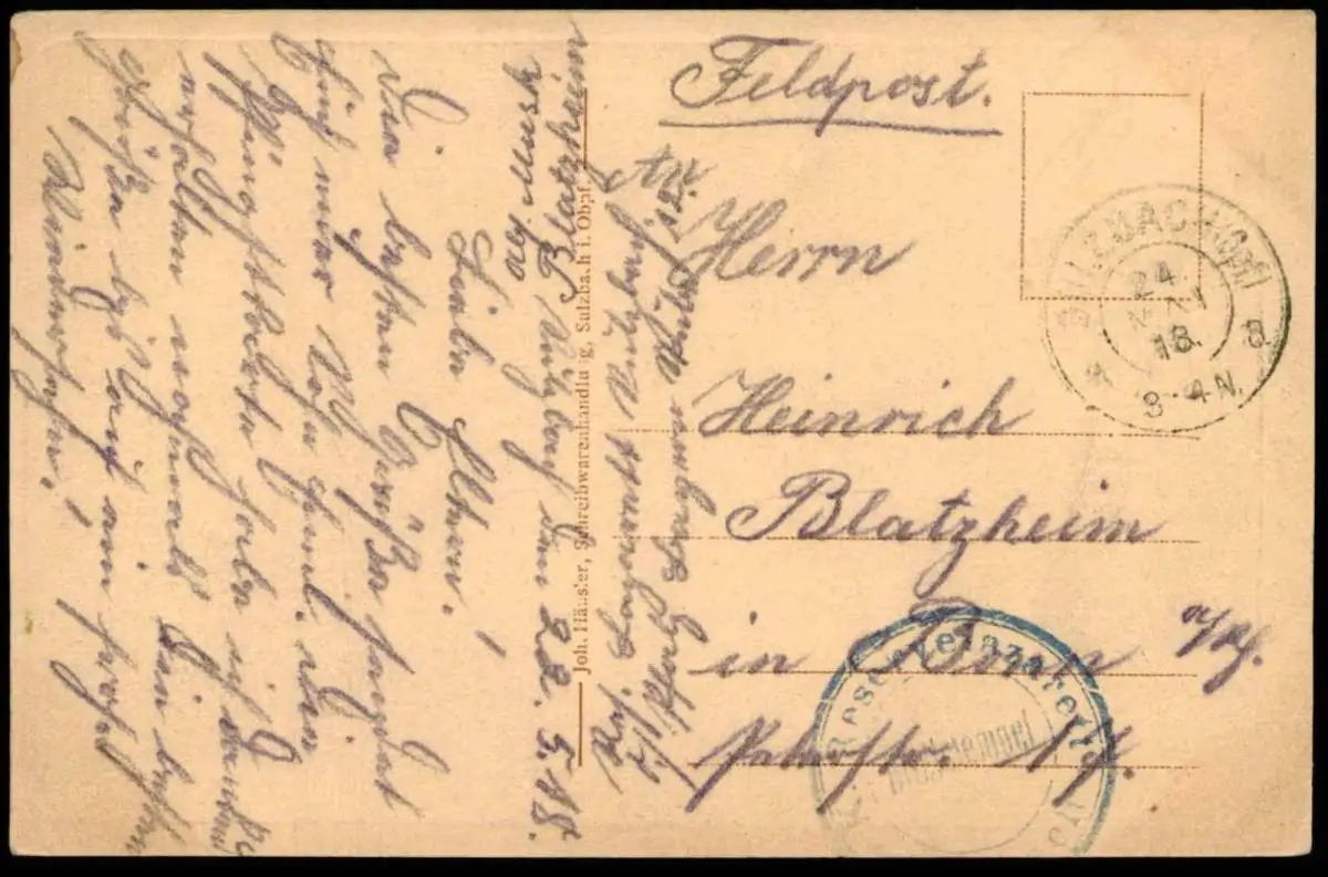 Verlag: Joh. Häusler, Sulzbach Gelaufen: 24.05.1918 als Feldpost mit Stempel Sulzbach sowie Briefstempel Reservelazarett nach BlatzheimErhaltung (s. Scan): gut / 917577