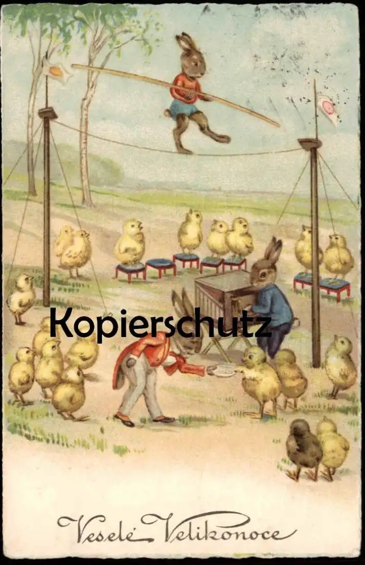 ALTE POSTKARTE VESELE VELIKONOCE FROHE OSTERN VERMENSCHLICHTE HASEN ZIRKUS DREHORGEL ORGEL Akrobat acrobat circus cirque
