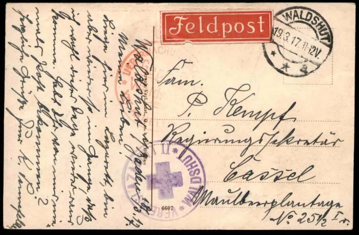 Gelaufen: 19.03.1917 mit Stempel Waldshut sowie Stempel Vereinslazarett Waldshut als Feldpost nach CasselErhaltung (s. Scan): gut - mittel, oben leicht bestoßen / 917317