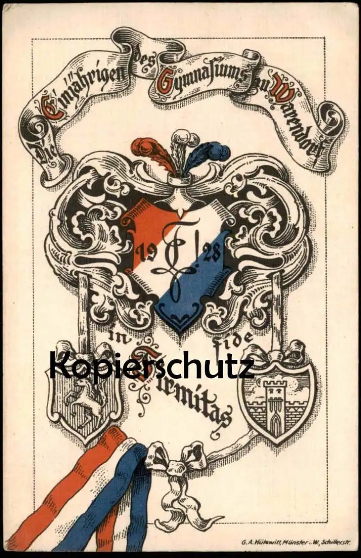 ALTE POSTKARTE WARENDORF GYMNASIUM EINJÄHRIGE IN FIRMITAS 1928 Schule Studentica Studentika Couleurkarte school postcard