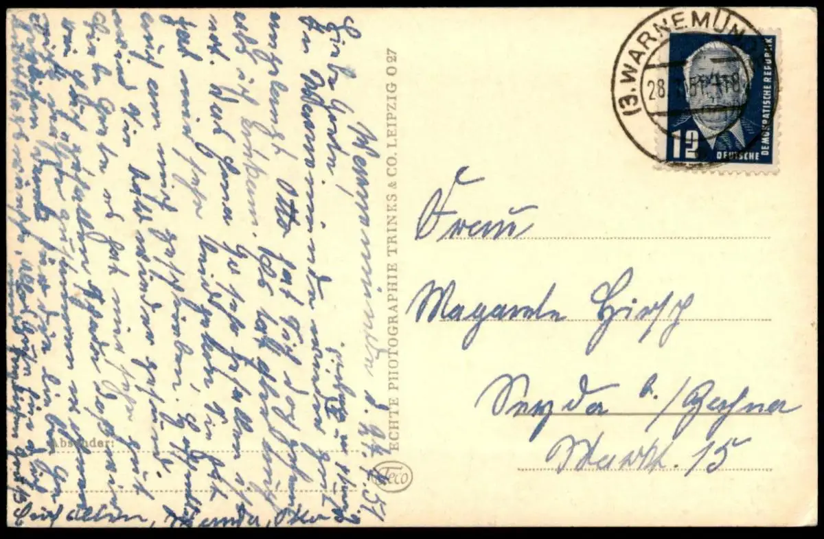 Gelaufen: 27.07.1951 mit Stempel Warnemünde nach Sayda