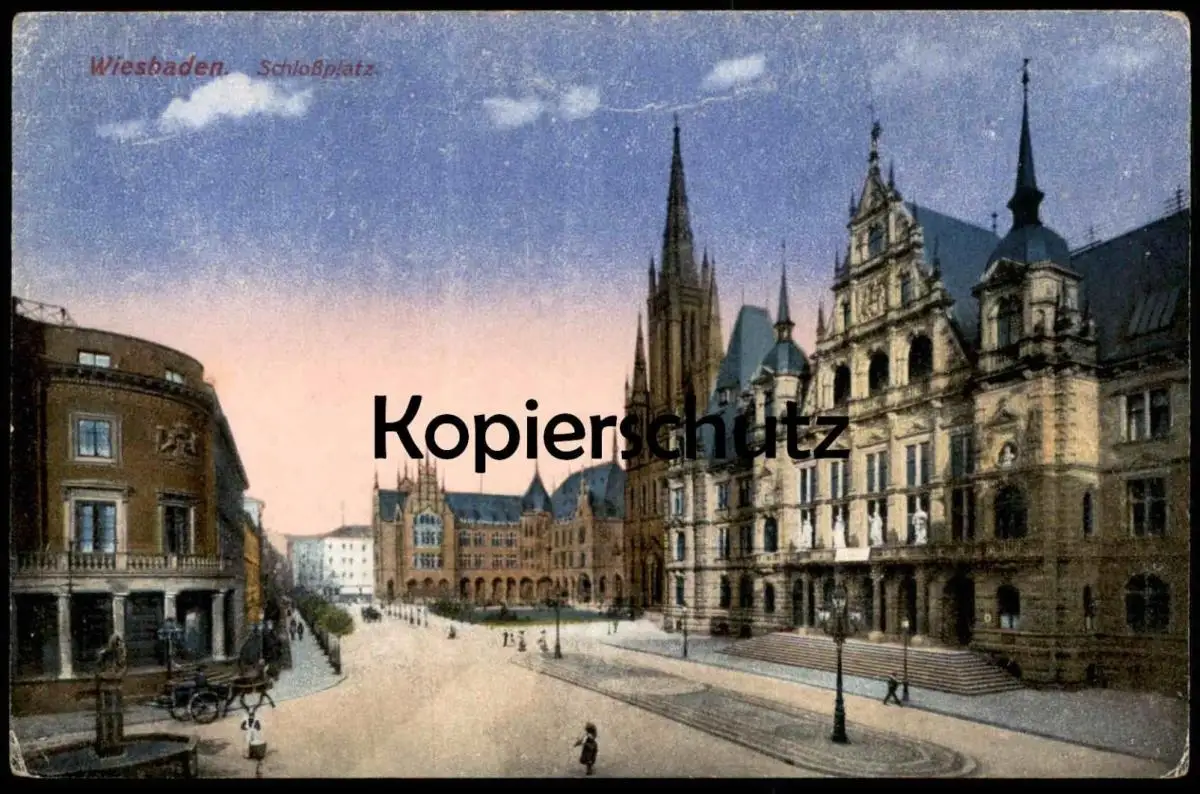 ALTE POSTKARTE WIESBADEN SCHLOSSPLATZ BRUNNEN KUTSCHE AK cpa postcard Ansichtskarte