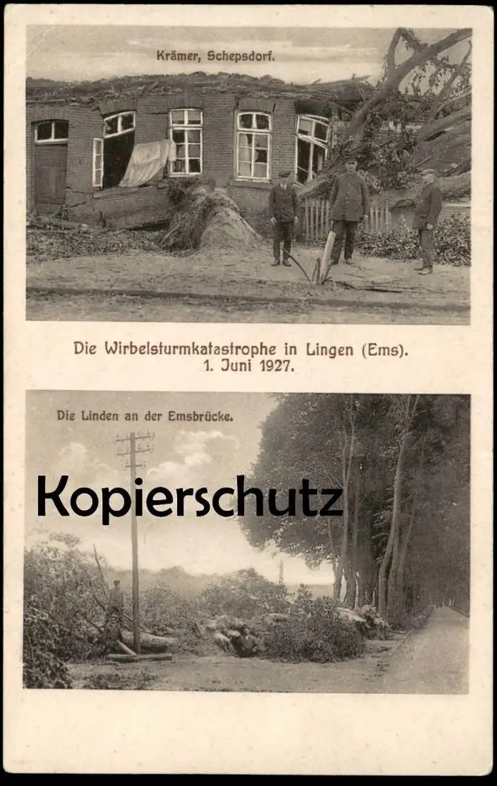 ALTE POSTKARTE WIRBELSTURMKATASTROPHE LINGEN 1. JUNI 1927 KRÄMER SCHEPSDORF LINDEN AN DER EMSBRÜCKE Sturm storm postcard