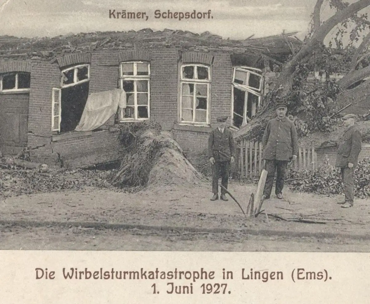 ALTE POSTKARTE WIRBELSTURMKATASTROPHE IN LINGEN 1. JUNI 1927 KRÄMER SCHEPSDORF LINDEN AN DER EMSBRÜCKEVerlag: L. Nottbeck und G. Klimmer, Lingen