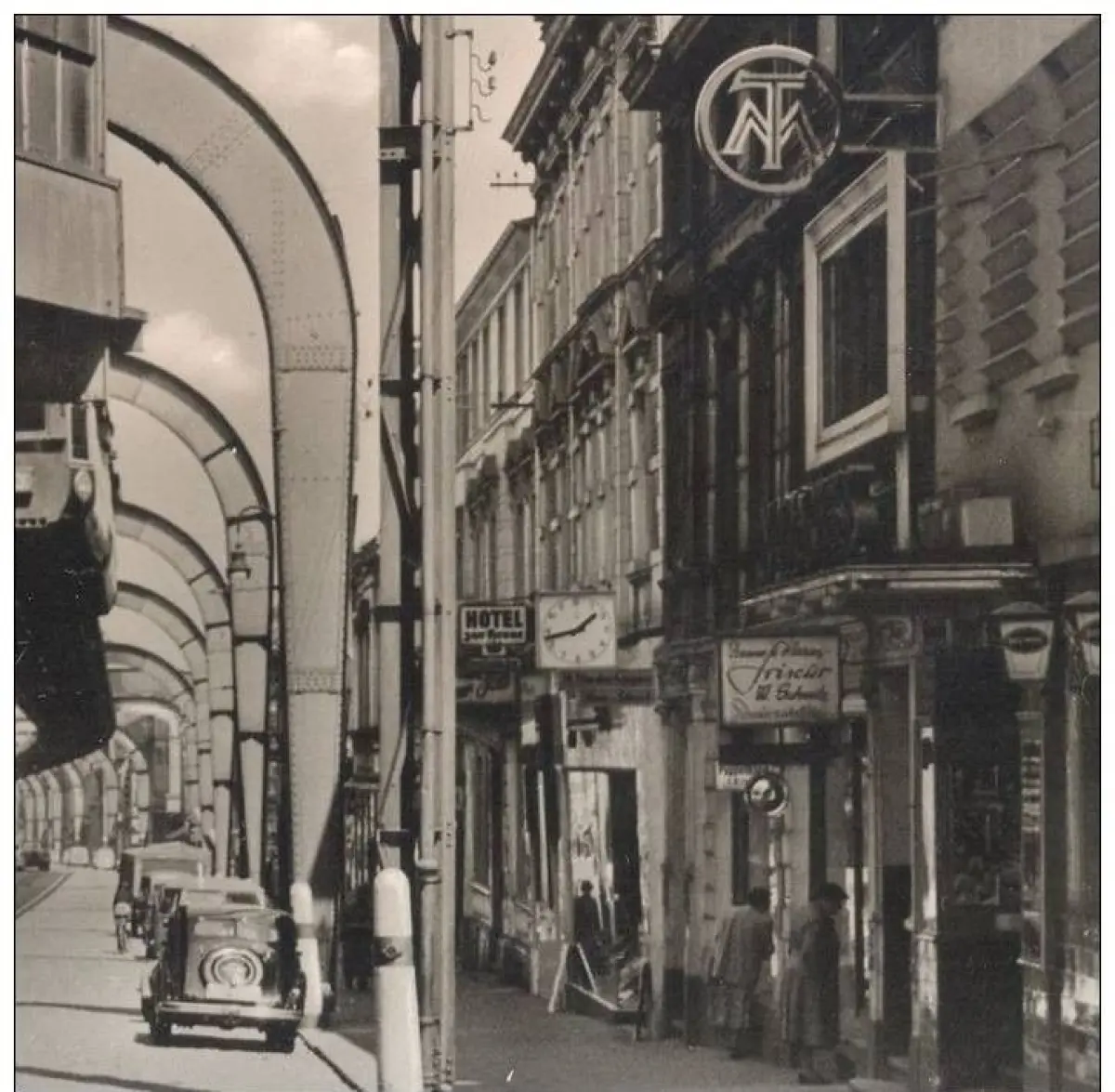 ALTE POSTKARTE WUPPERTAL VOHWINKEL AM SCHWEBEBAHNHOF DIE SCHWEBEBAHN HAT 20 BAHNHÖFE Hotel zur Krone Friseur Schmitz