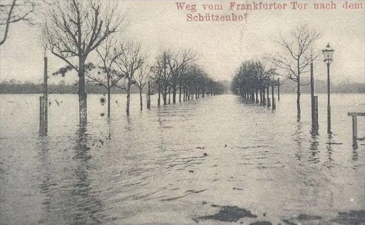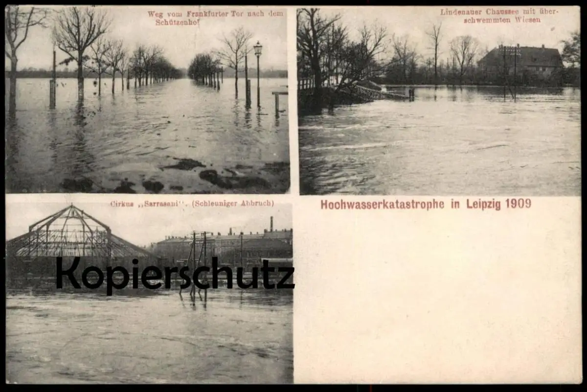 ALTE POSTKARTE ZIRKUS HOCHWASSERKATASTROPHE IN LEIPZIG 1909 SARRASANI SCHLEUNIGER ABBRUCH WEG VOM FRANKFURTER TOR NACH DEM SCHÜTZENHOF LINDENAUER CHAUSSEE MIT ÜBERSCHWEMMTEN WIESEN